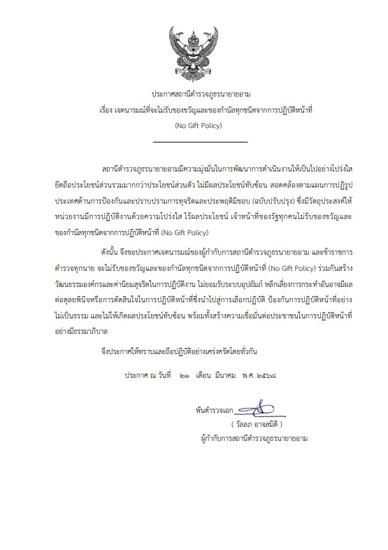 ประกาศเจตนารมณ์ที่จะไม่รับของขวัญและของกำนัลทุกชนิดจากการปฏิบัติหน้าที่ (No Gift Policy) ของสถานีตำรวจ